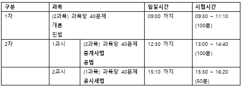2차과목 2교시는 15:30~16:20, 총 50분으로 공시법 및 세법 40문제가 출제됩니다.